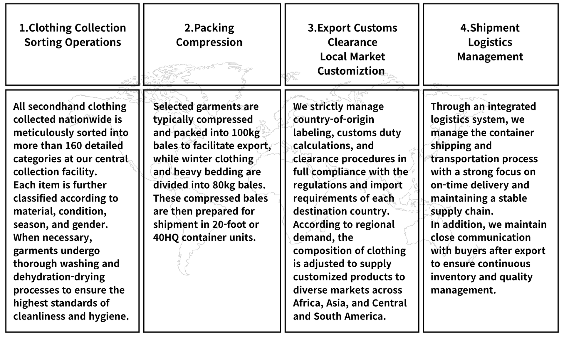 A.The approximately 160 items produced by Kisuk include secondhand clothing, secondhand bags, secondhand shoes, and various other household textile products. In addition, the company exports a variety of items such as military boots, military uniforms, other military gear, and recycled bowls.